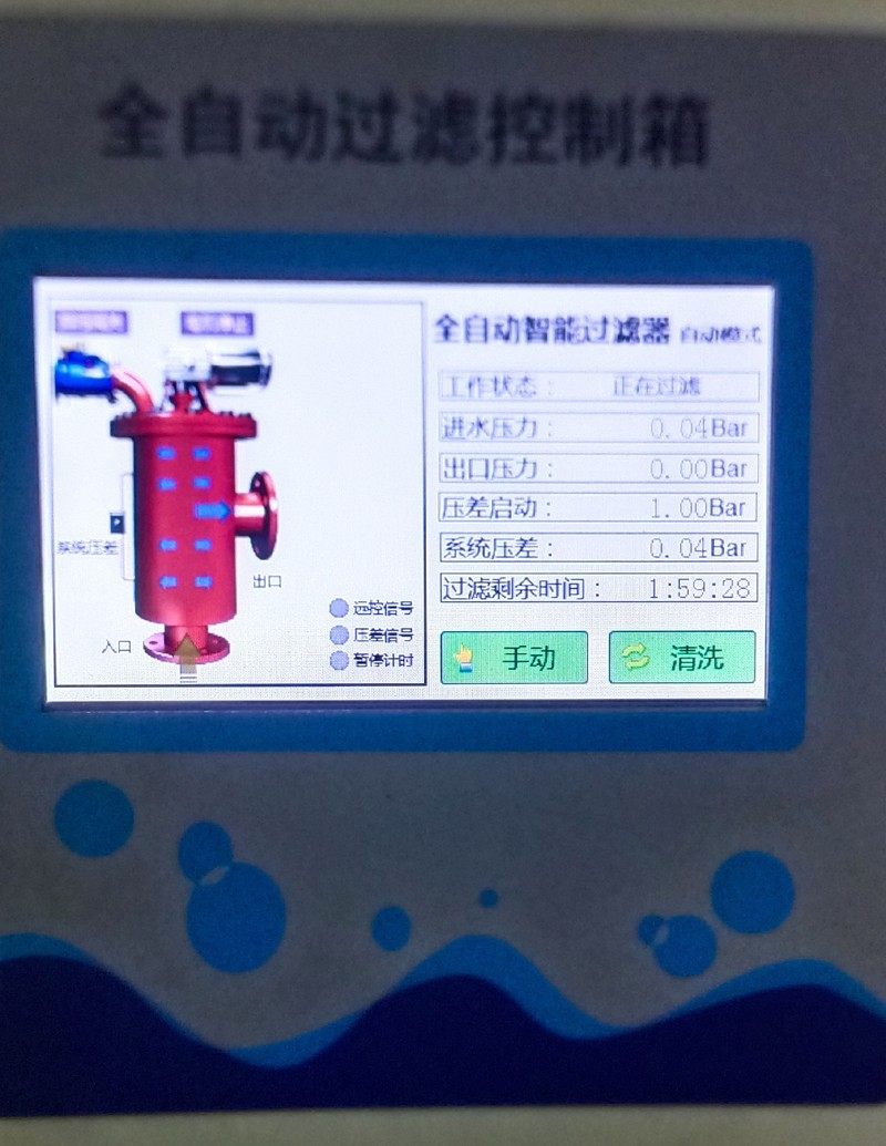 自动控制:自动控制有定时和压差两个方式。在过滤时间定时器上设定过滤时间,当过滤时间到,启动排污,排污时间由排污时间定时器设定;同时控制系统实时将系统压差与用户设定的压差相比较,当系统压差达到设定压差时,过滤器也进行清洗排污,排污时间由排污时间定时器设定。排污时间到,停止清洗,系统恢复至其初始状态,为下一个过滤工序作好准备。